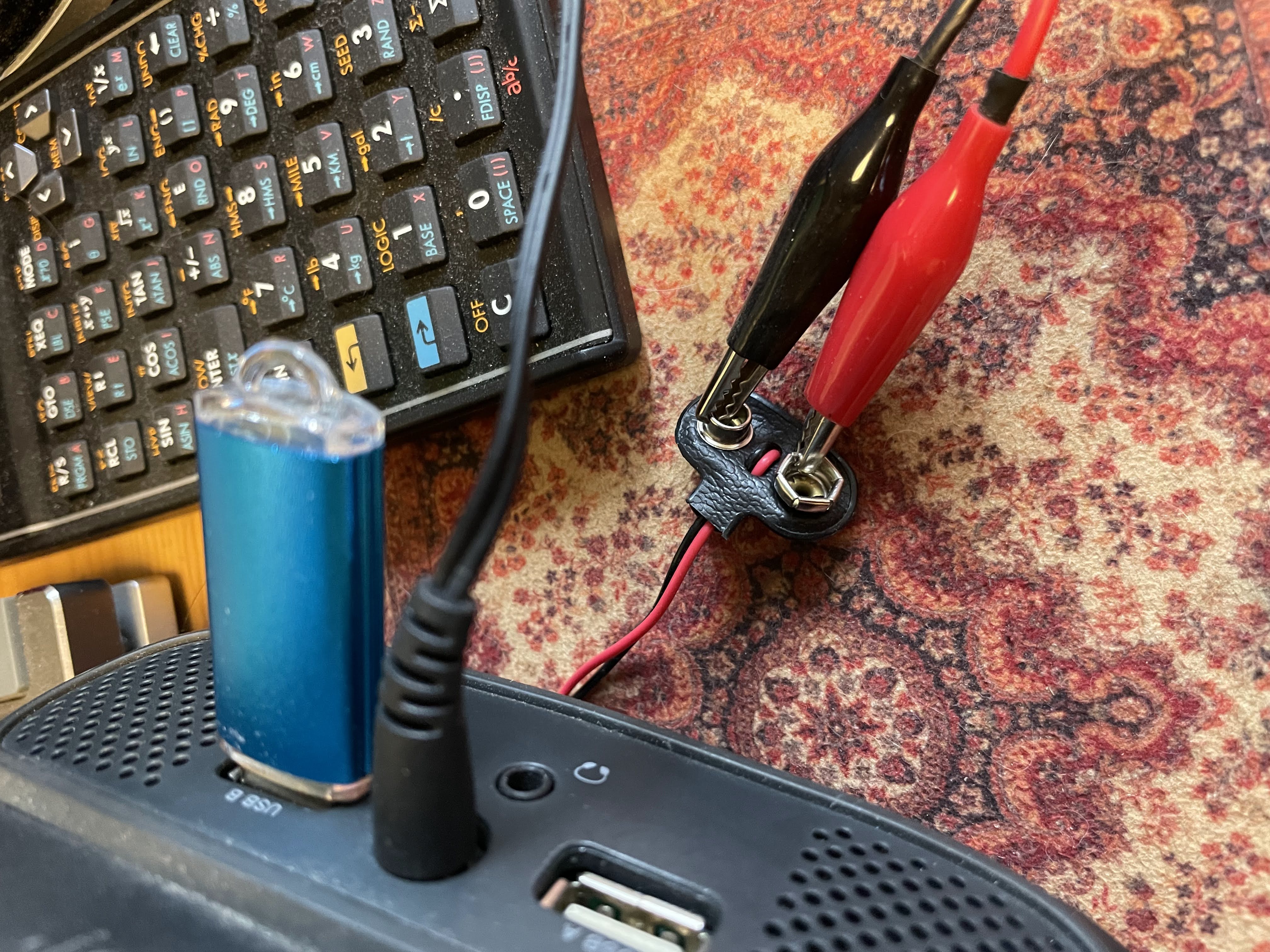 Chumby の内蔵バッテリーコネクタ(底面から取り出す)に、測りたい電圧の測定物を接続すると、電圧表示ができます。